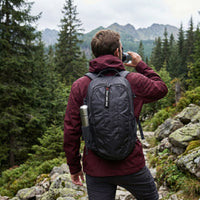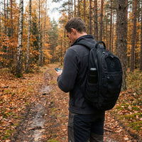 Mugursoma melnā krāsā vīrietim mugurā pārgajienā mežā